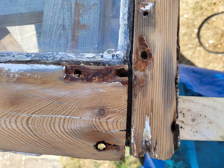 The “L” brackets used in a previous attempt to keep one of the sashes together, unfortunately, had only served to speed up the rot inside the joint. This particular sash had been painted shut for a while, but we were asked if we could get it opening again as part of the repair.