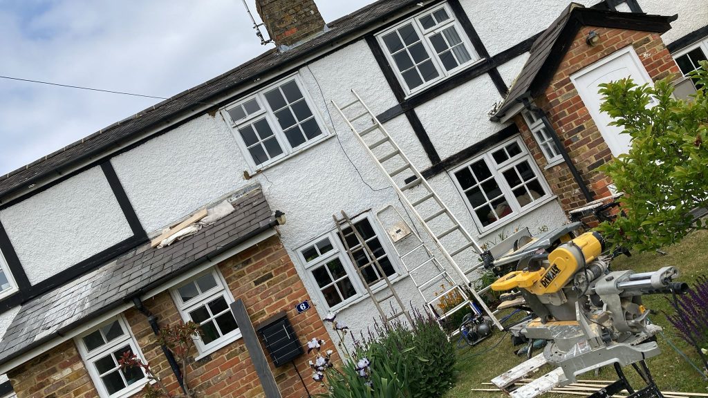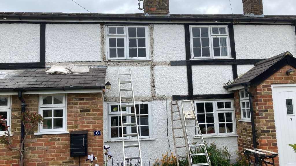 After carefully removing the cladding, we needed to tidy up the wall behind to ensure we had a good fixing medium and made the decorators job a little easier by giving the render a coat of white paint.