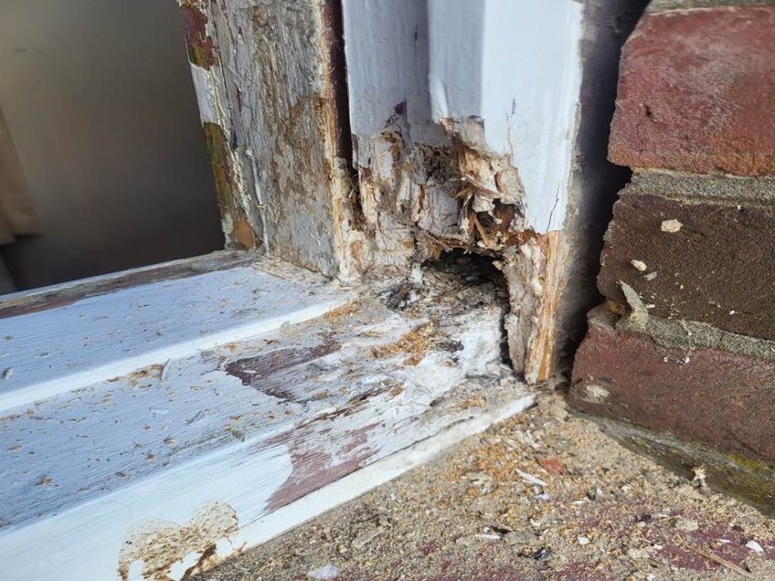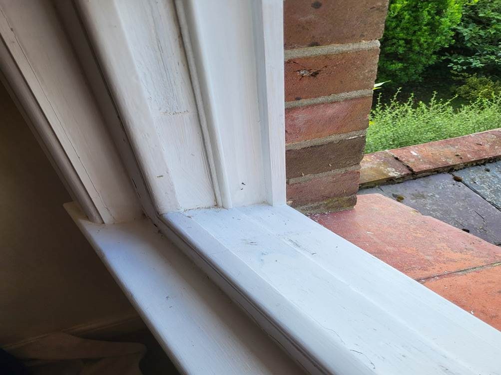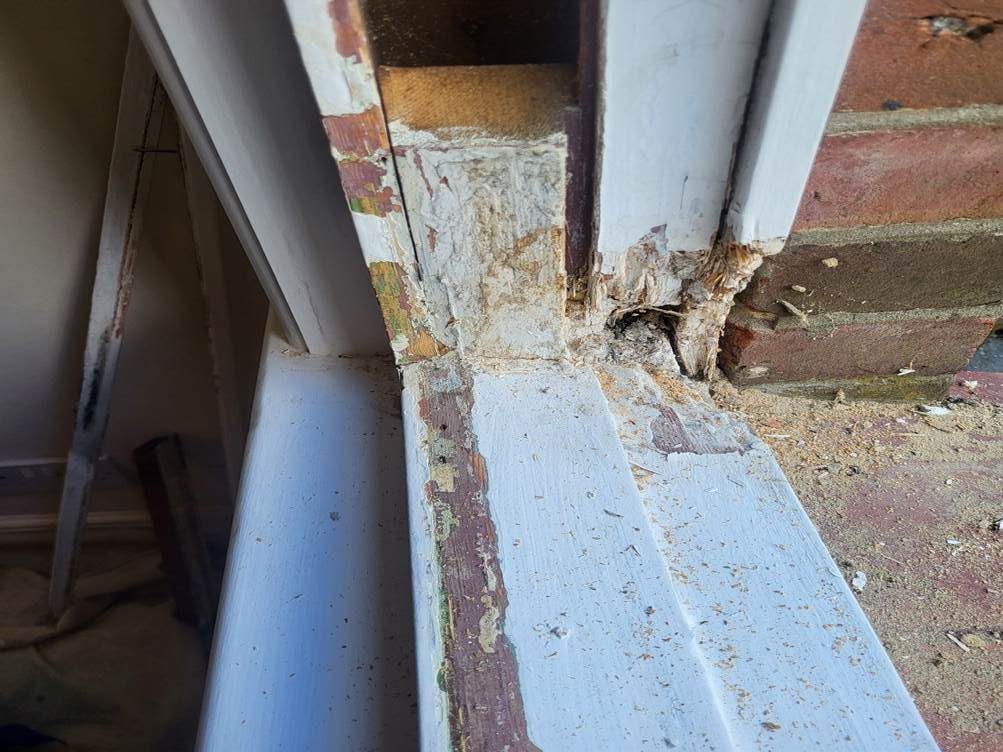 This 1920s sash window is original to the house with the brickwork built around the window. Being North facing, it wasn’t getting much opportunity to dry out after rain so despite the owners diligent upkeep, this particular area of the window was suffering. During redecoration the previous year, the area had been treated with filler but unfortunately this had only served to further trap moisture inside the wood and accelerate the rot.